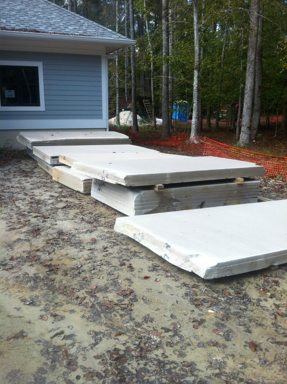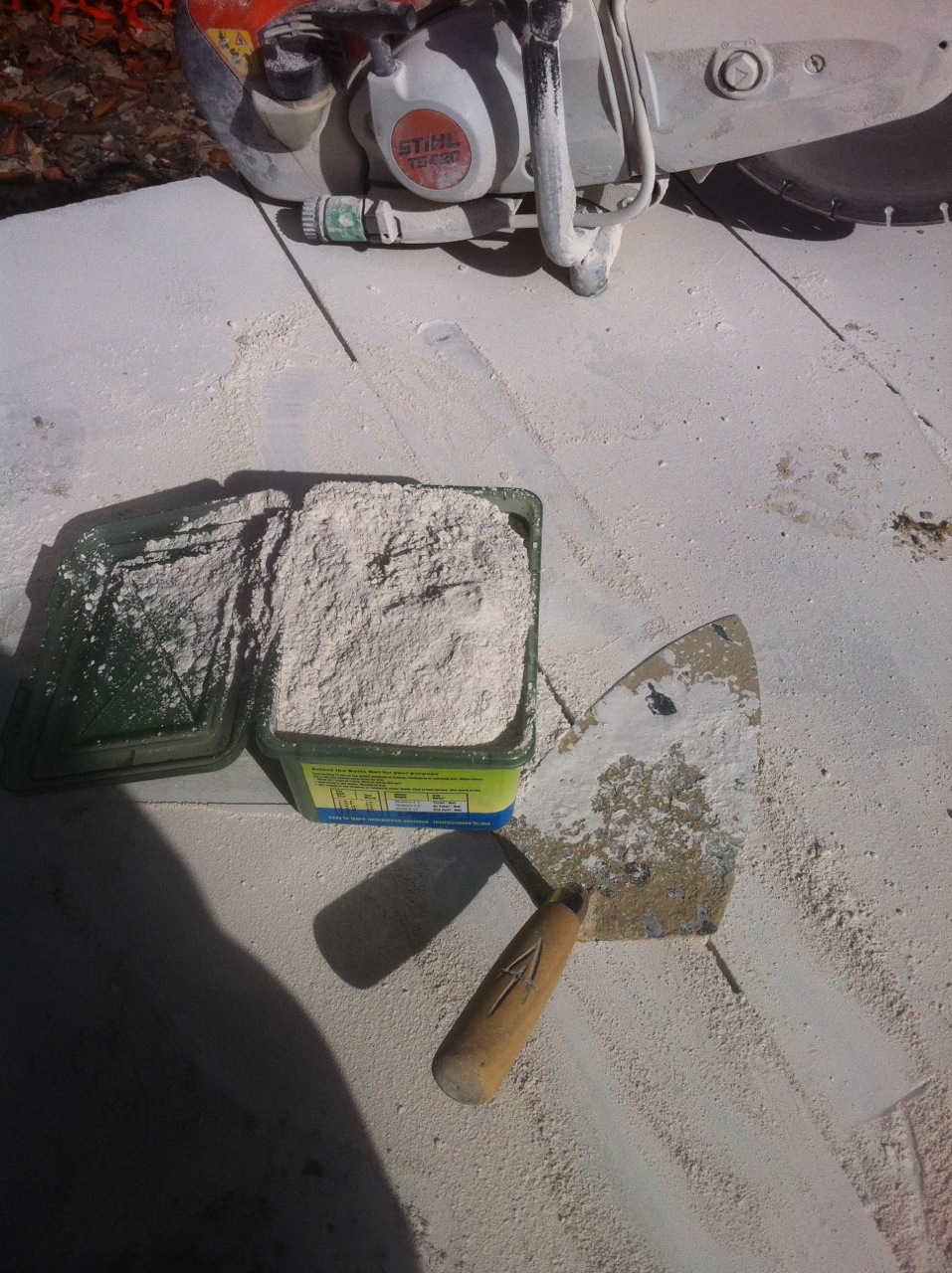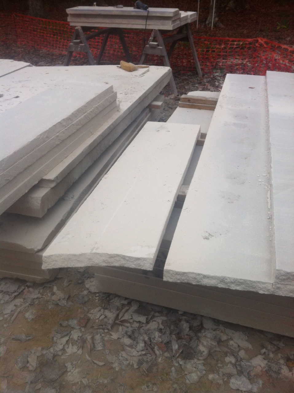 A fascinating fact about this particular type of limestone is that two – 9 feet cuts, will create almost a solid pound of limestone dust. This reclaimed dust can then be mixed with a surfactant and used to make any repairs that may be necessary throughout the installation process as shown below.