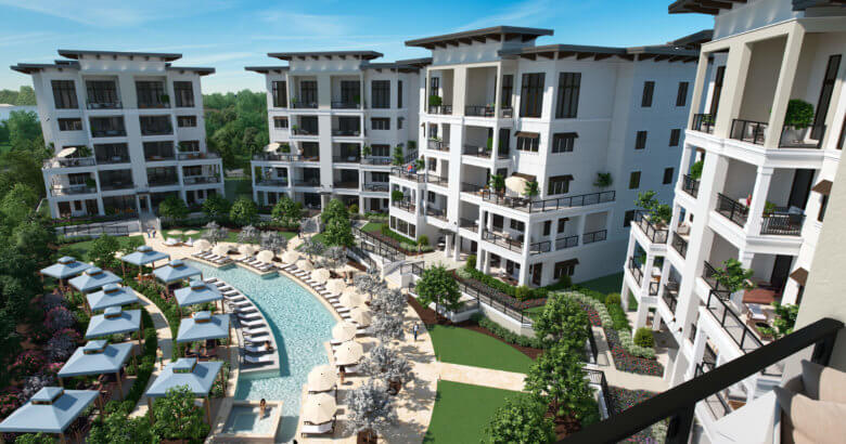 This beautiful North Carolina complex encompasses 5 structures each with a parking garage at the first floor. The principle condo building has a large clubhouse with an event hall and gym. There are a total of 48 units providing a variety of balconies and covered lanais to create outdoor spaces for the residence. The penthouses have 14’ high ceilings and private garages. There is a luxurious raised pool deck with individual cabanas for relaxing.