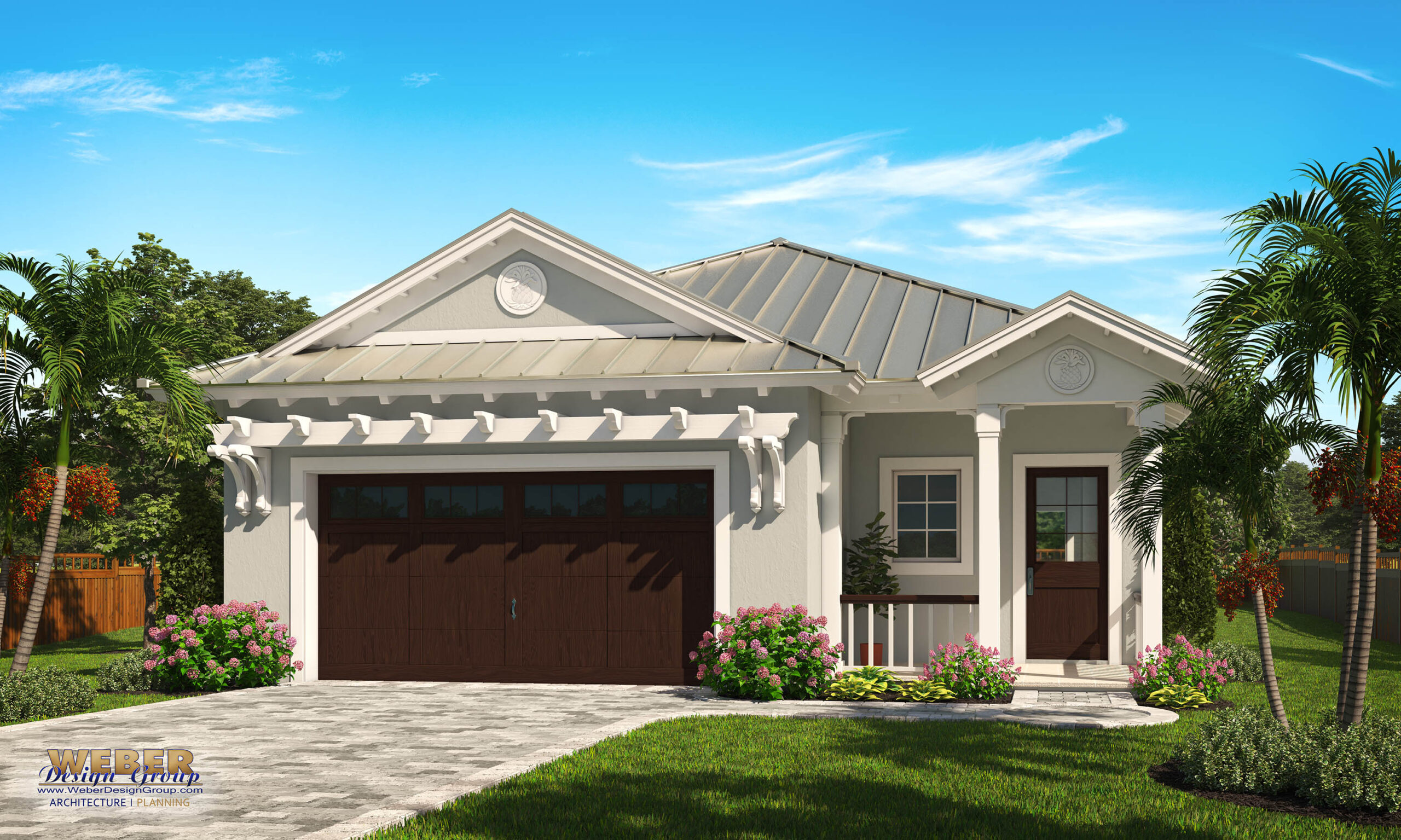Ocean ridge stock home plan photo of front elevation, driveway, garage, lawn, palm under blue skies. House plan designed by Naples architect Weber Design Group.