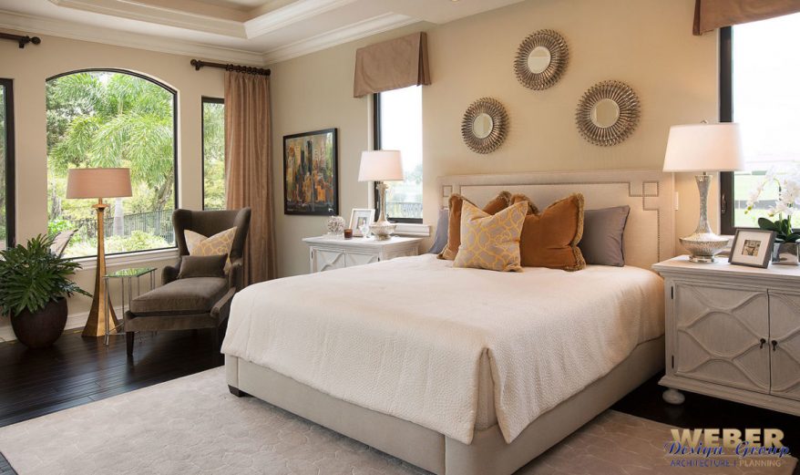 The master suite provides a private retreat. It includes a luxurious master bath and generous walk-in closets. Large windows and glass doors bring in natural light and enhance the connection to outdoor living.