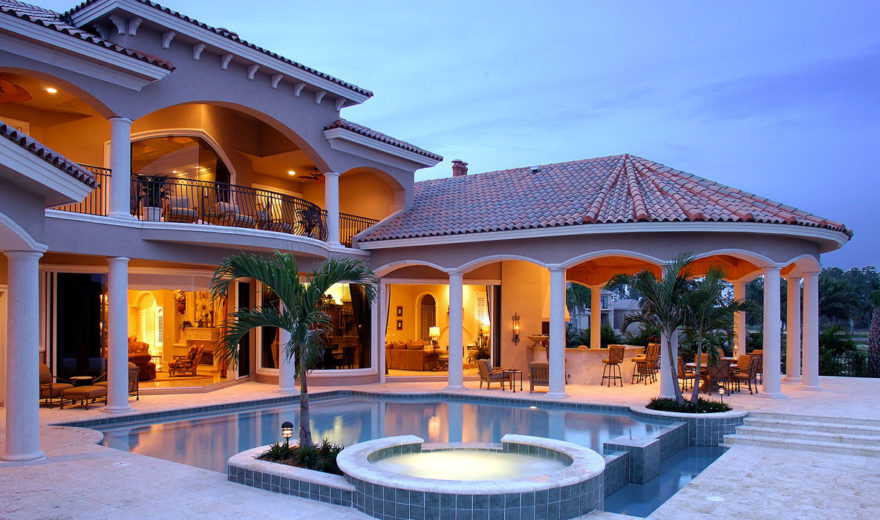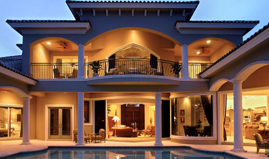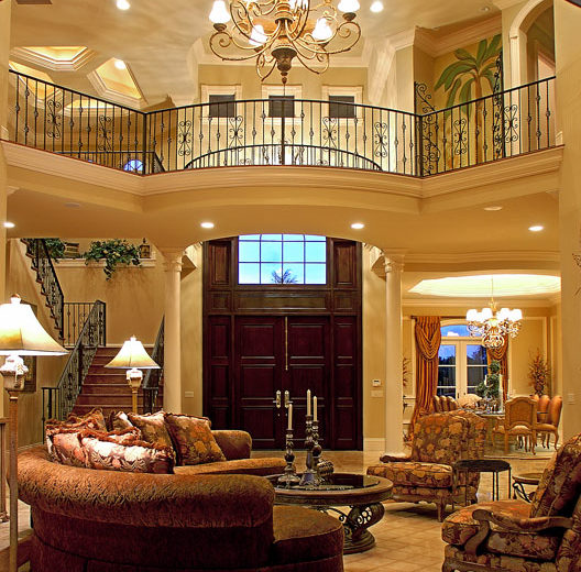 The Cantrell house plan is a stunning two-story Mediterranean design with luxury features and thoughtful spaces for family living and entertaining. Stylish front steps lead to a broad veranda with large double-entry front doors that welcome you into a grand foyer. From here, you see the pool area and beyond through large pocket sliding-glass doors in the living room. A fireplace and built-in shelves anchor the living room and add warm elegance.