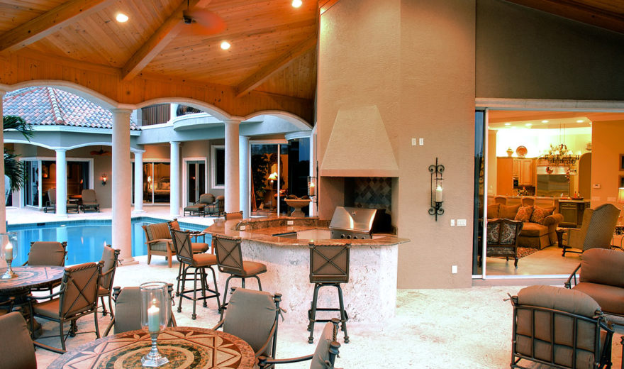 Next to the living room, an arched opening beside a walk-in wet bar leads to an oversized family room. This space has a built-in entertainment center and a second fireplace. Large pocket-sliders open to a covered lanai and outdoor kitchen area, perfect for gatherings.