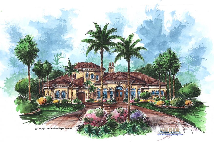 The Ixora house plan is a striking Mediterranean two-story design crafted for spectacular rear-view waterfront home sites. It opens with a welcoming foyer that flows into a spacious dining room and a very large living room. Natural light floods these spaces through a wall of glass that captures uninterrupted views of the pool and sunset bay.