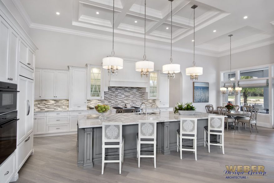 The gourmet kitchen blends function and style. A large central island provides generous workspace and seating for casual meals or entertaining. In addition, ample cabinetry and a walk-in pantry offer excellent storage. The kitchen overlooks both the great room and outdoor spaces, which allows hosts to stay engaged with family and guests while cooking.