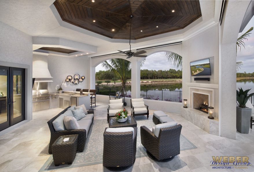 Outdoor living plays a central role in the Serrano House Plan. Covered lanais and an integrated outdoor kitchen extend the living space beyond the interior walls. These areas support year-round enjoyment in warm climates and work especially well on waterfront or view-oriented lots. Whether hosting a gathering or enjoying a quiet evening, the outdoor spaces adapt easily to different lifestyles.
