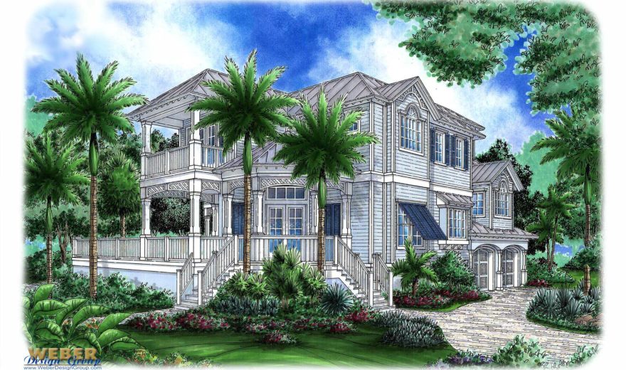 A two floor Kew West style home with upper and lower covered porch designed by Naples architect Weber Design Group.