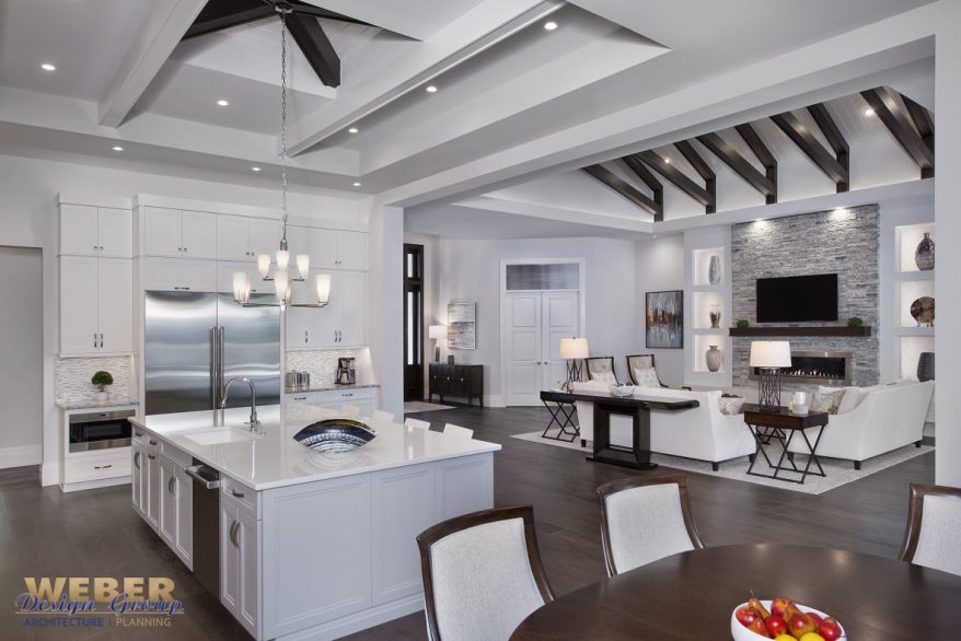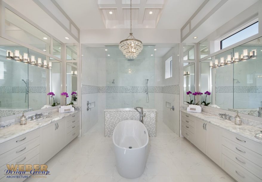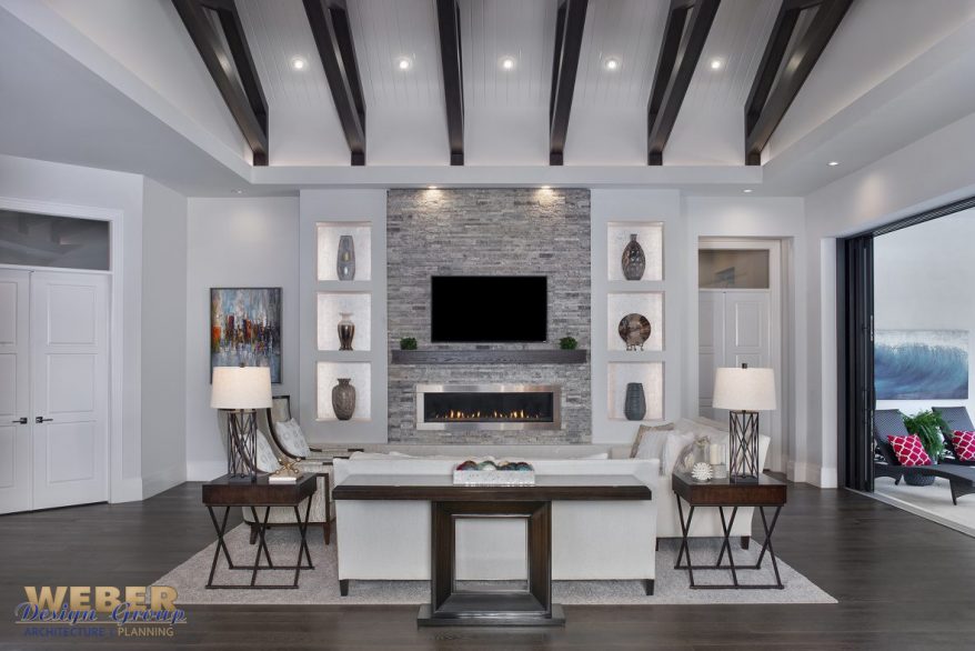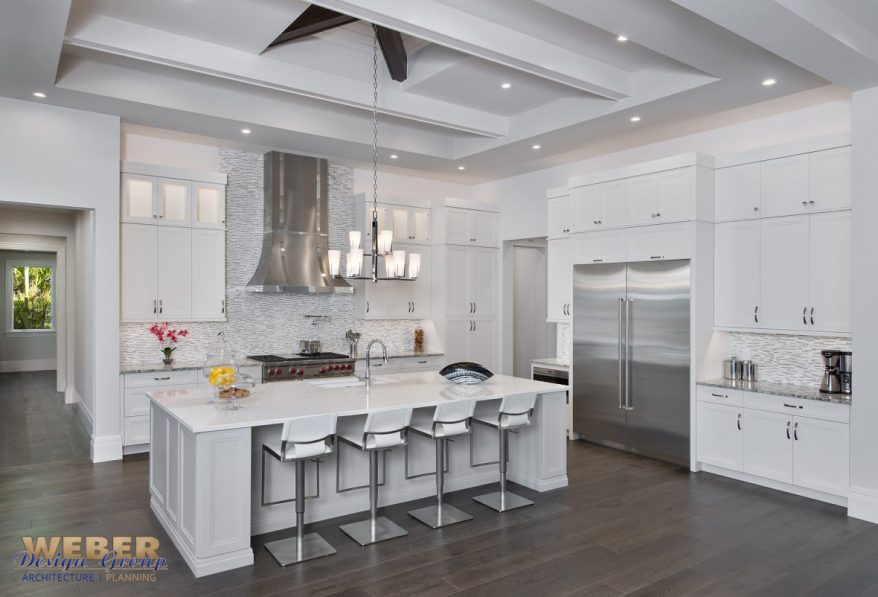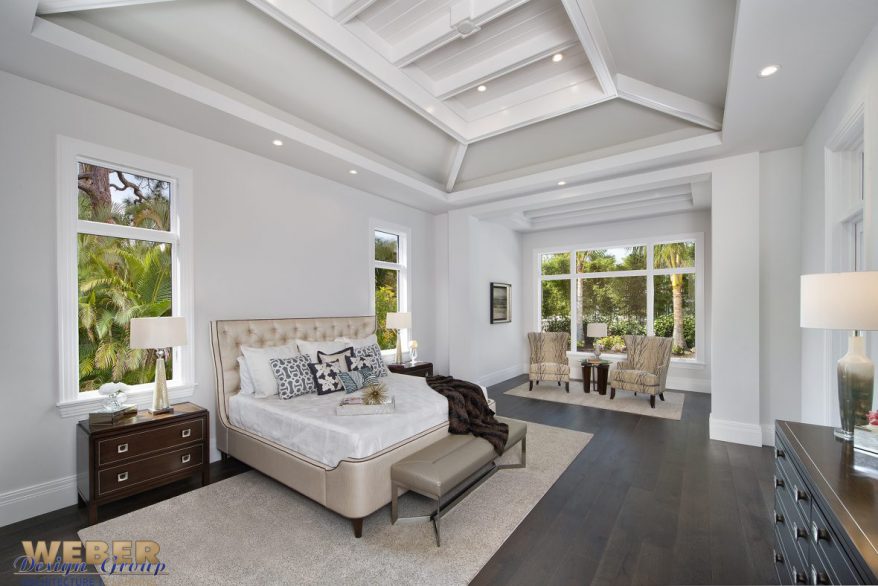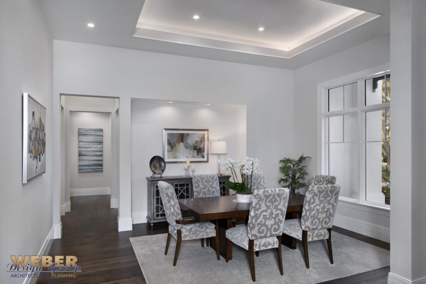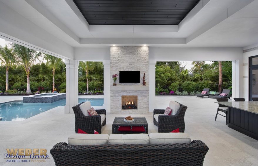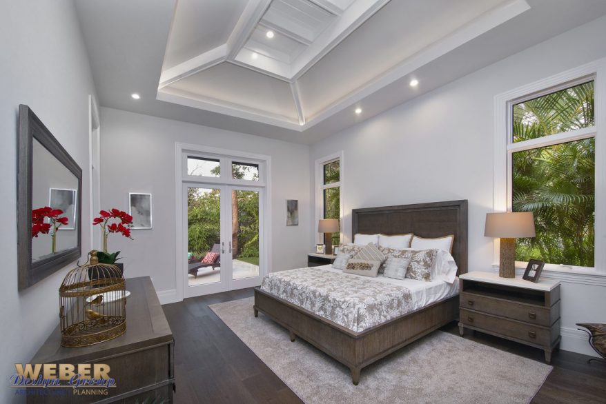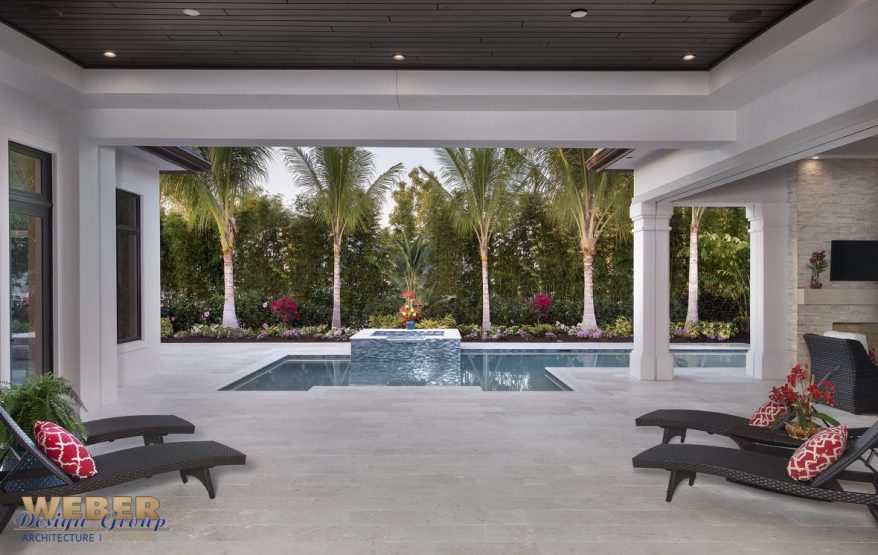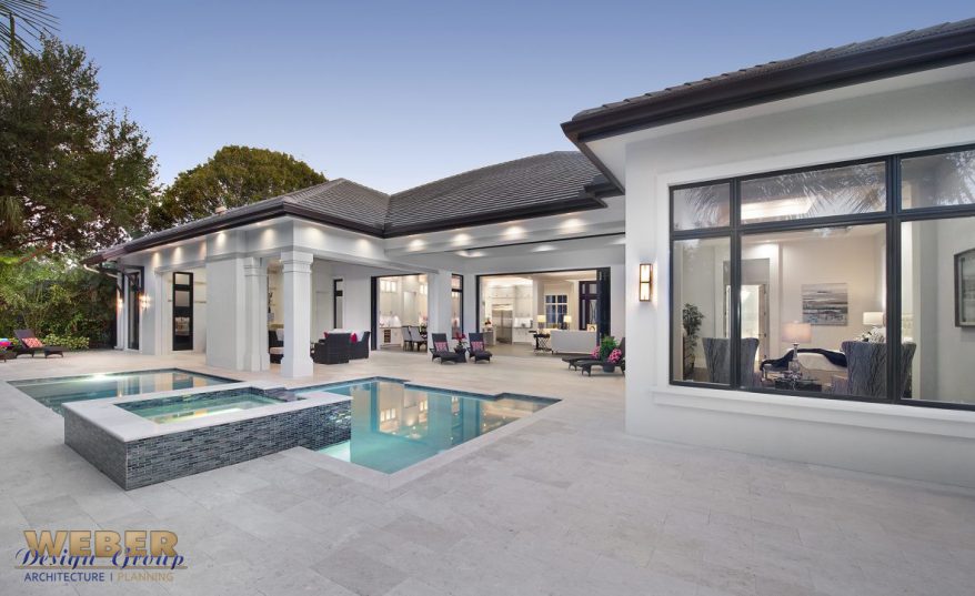 Clean contemporary lines are perfectly complemented by softer more laid-back West Indies style embellishments on the front façade of this home built in downtown Naples, Florida. The raised entry and covered front porch bring you to a 12’ Mahogany and glass door flanked by two large windows that allow natural light to flow abundantly into the foyer. Bahama shutter accents and pergolas over each garage door provide a wonderful contrast to the smooth stucco finished exterior with flat tile roof.