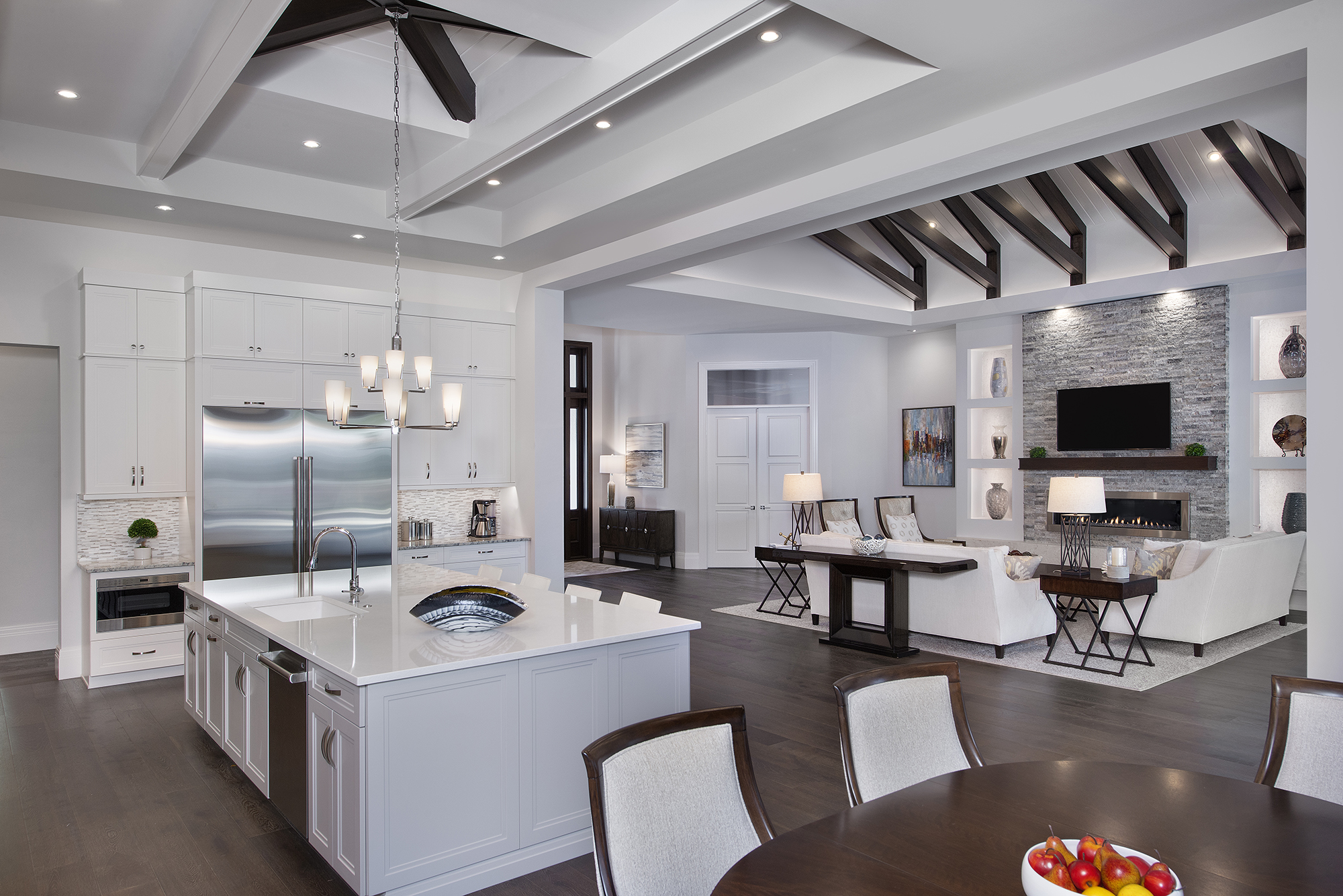 Image of Coral Drive great kitchen, island, great room, fireplace mount tv, ceiling detail exposed beams. Designed in Naples by architects at Weber Design Group.