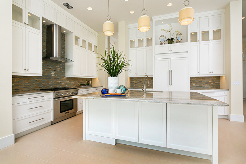 Naples architect. White cabinets, stainless appliances, granite counter, tile backsplash all pictured.