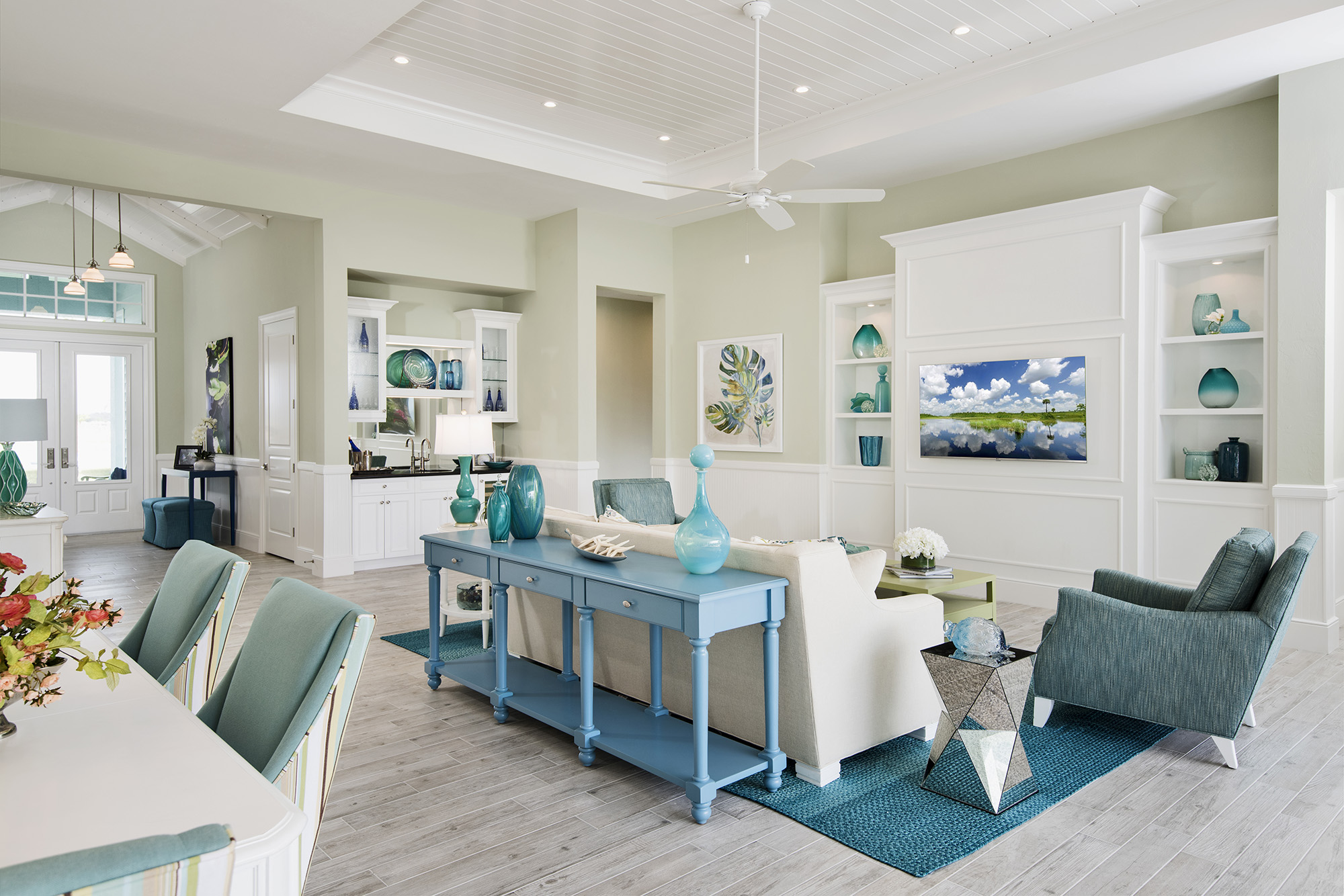 Great room custom design by Naples/Palm Beach architect, white, light, spacious, blue accent, tray ceilings. House designed by Naples architect Weber Design Group.