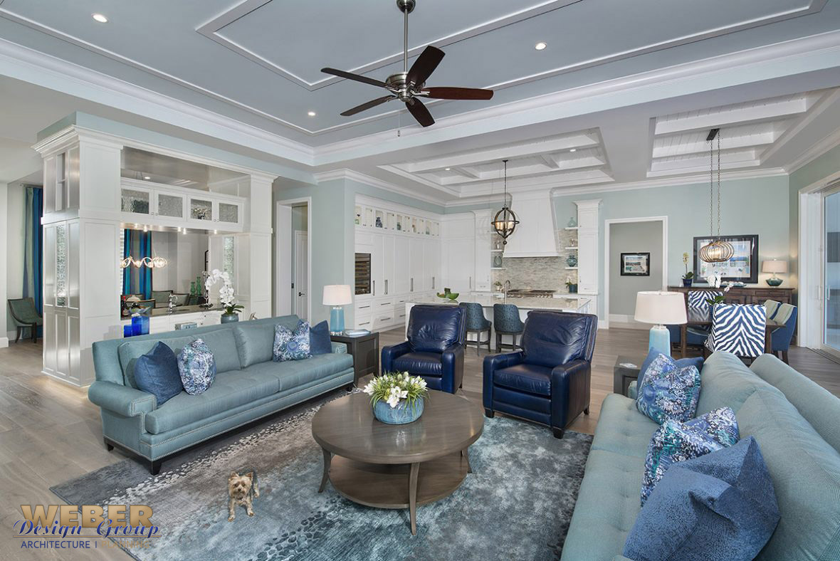 Great room & kitchen in a transitional West Indies style home by Weber Design Group