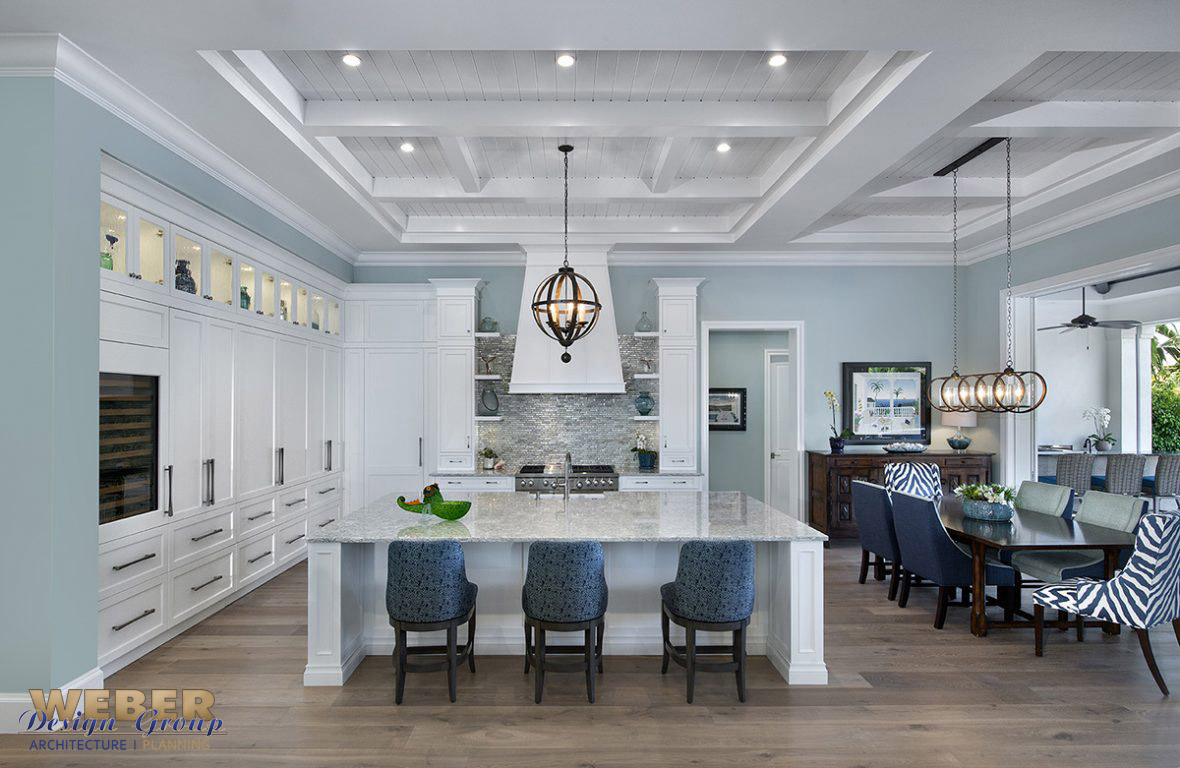 Kitchen and island area in transitional West Indies style home by Weber Design Group.