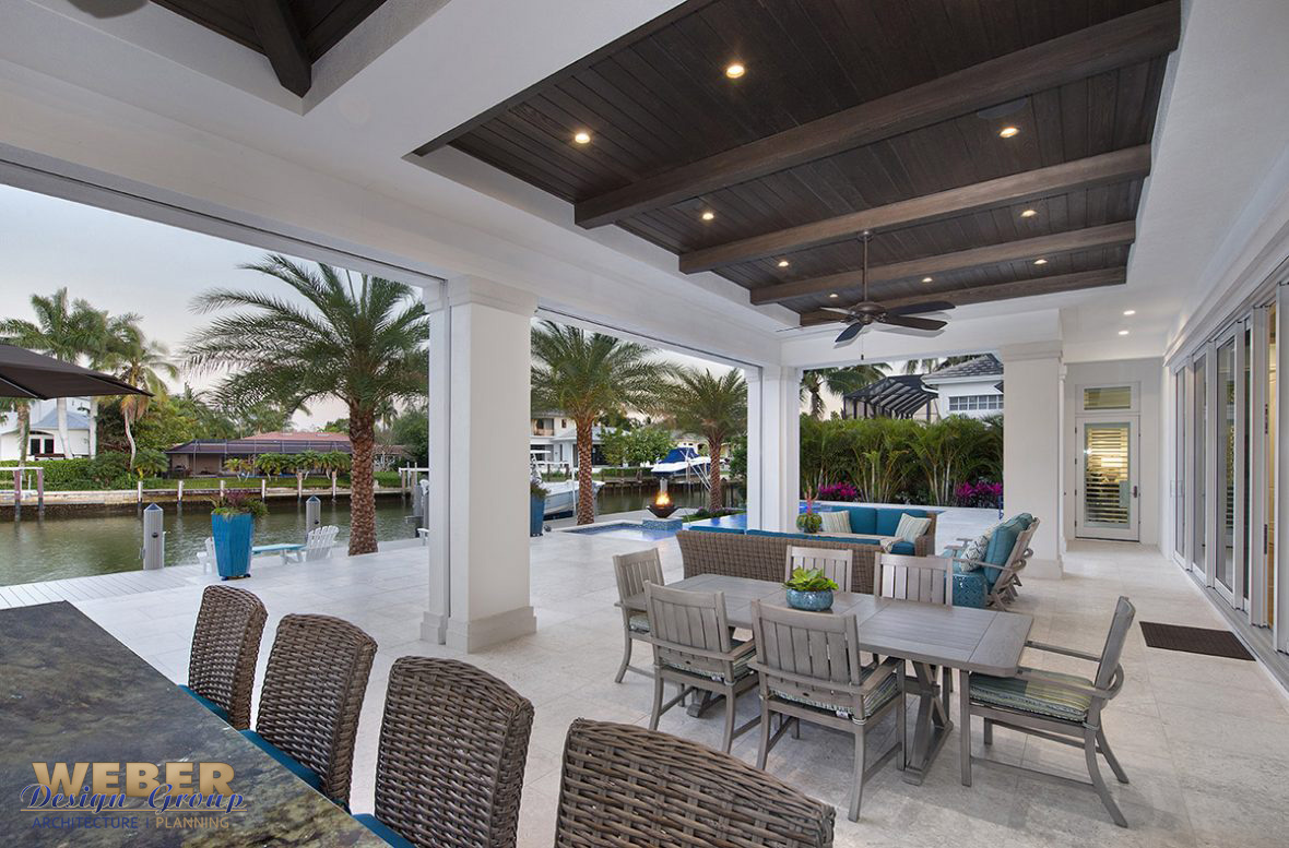 Transitional West Indies style lanai, outdoor sitting area with pool.