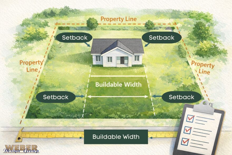 First, verify the buildable width and depth of the lot. Local zoning regulations typically require setbacks, which are minimum distances the home must sit away from property lines. These setbacks can significantly reduce the space available for the house footprint.