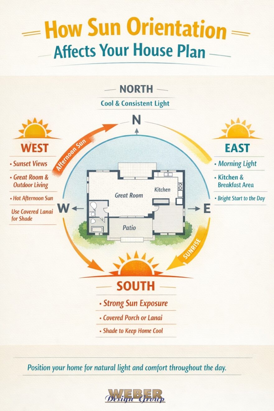 Some homeowners prefer a rear living area that captures sunset views, while others prefer morning sunlight in the kitchen or breakfast area. Understanding how the sun moves across your property can help you position the home in a way that improves both livability and energy efficiency.